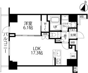 スタンダードな1LDKの間取りにWICが付いていて使いやすい部屋の形をしています。