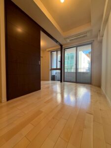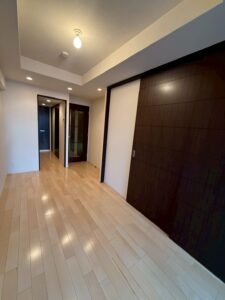 ダークグレーの建具と明るめのフローリングが採用されており、