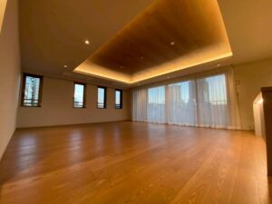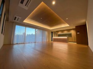 折上げ天井+間接照明がLDKに上質な開放感を演出します。