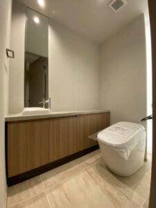 トイレは手洗い場+鏡付きのタンクレスタイプ。