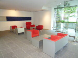 エントランスには赤を基調とした椅子や装飾が
